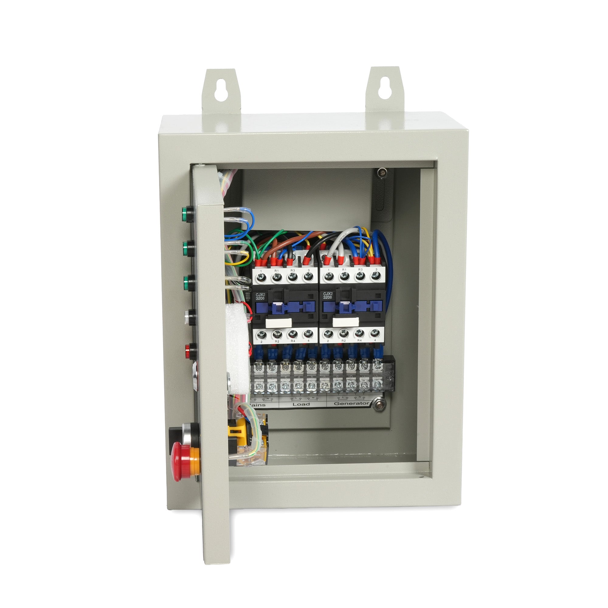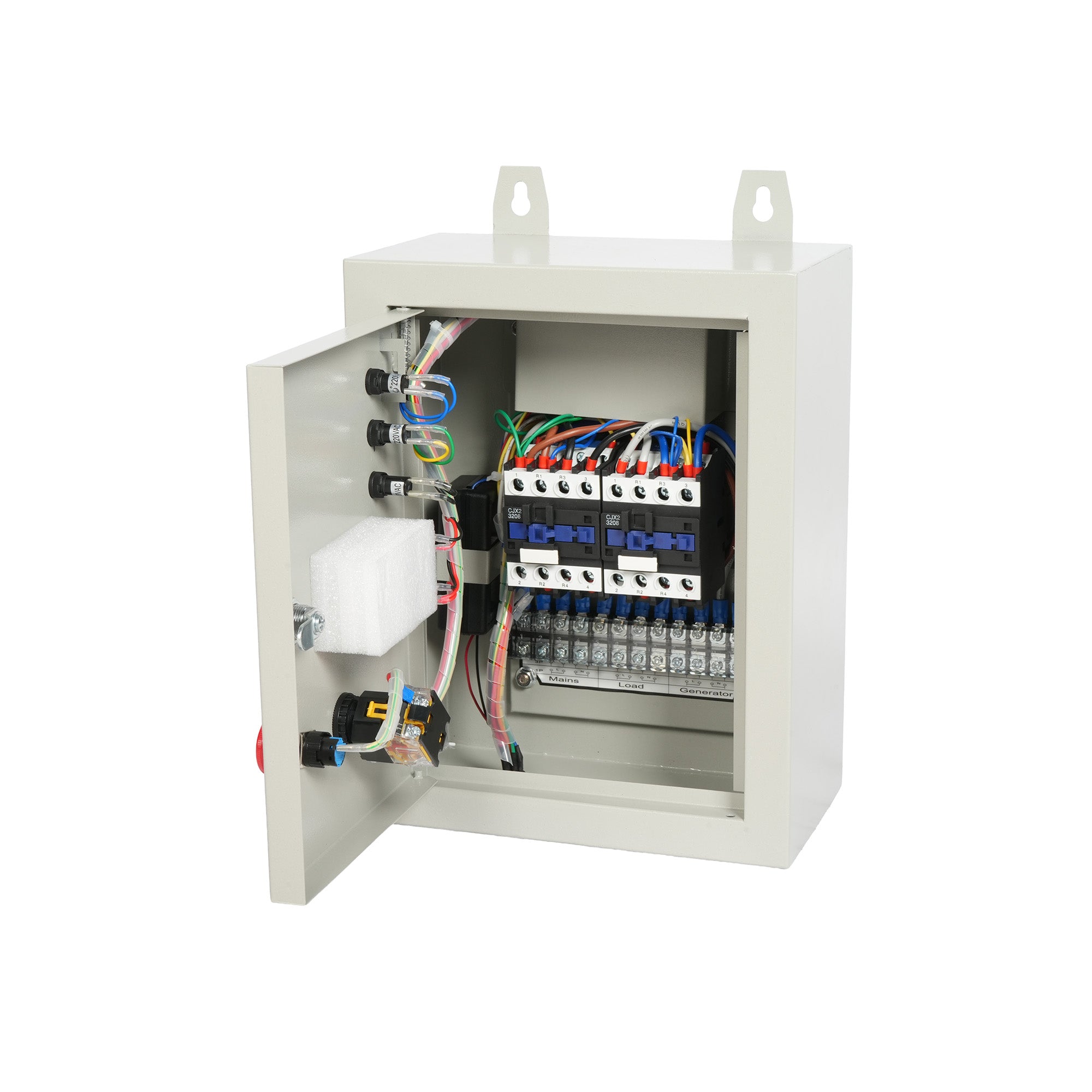 - Conexiones Internas: Terminales claramente etiquetados para Mains (Red), Load (Carga) y Generator (Generador), protegidos por una cubierta transparente