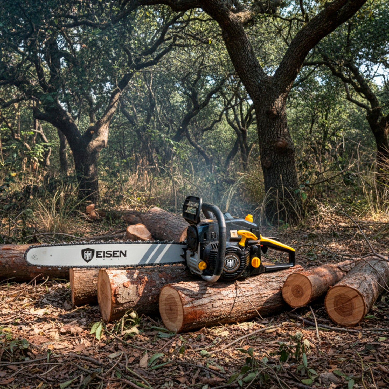 Motosierra Eisen la única del mercado con la potencia suficiente para derribar árboles o troncos de gran magnitud, su diseño alemán tiene una ergonomía superior, que deja la comodidad como primera opción. Además de un sistema de seguridad superior.